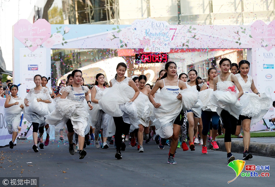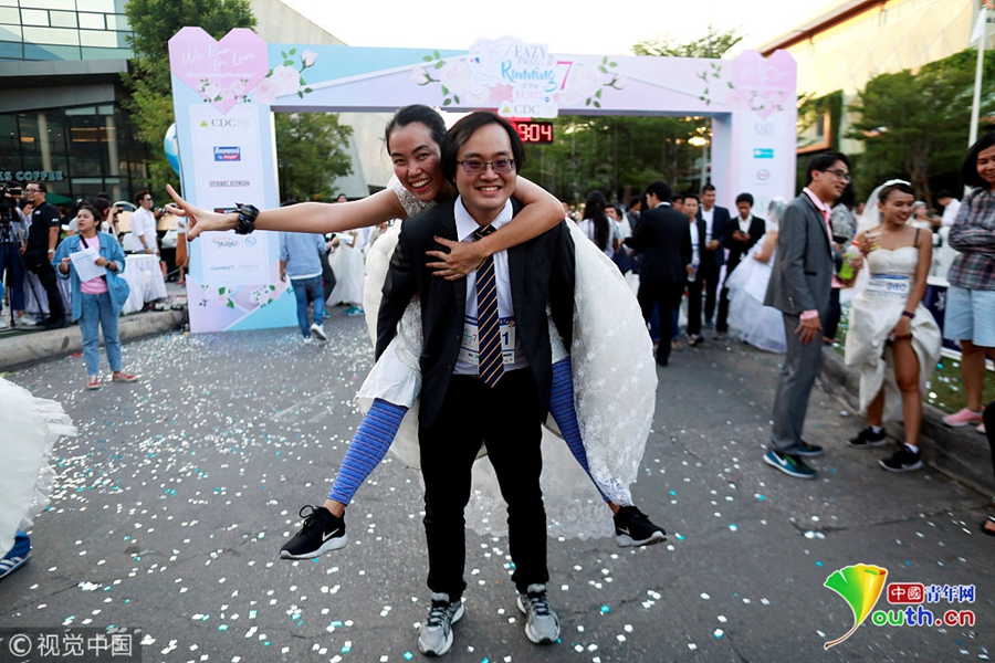 當(dāng)?shù)貢r間2018年11月24日,泰國曼谷舉辦新娘賽跑活動,獲勝者將獲得婚禮的全額資助,眾多新娘在街頭提裙狂奔。情侶沖過終點合影。