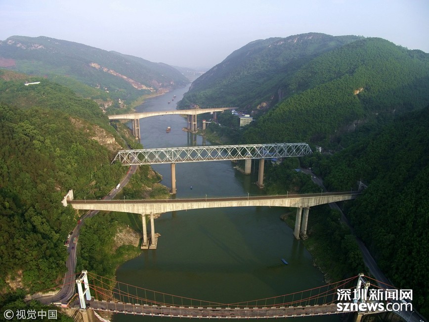 2018年5月18日,重慶,在嘉陵江重慶觀音峽段,間隔不到1000米的江面上橫跨著五座大橋,形成了五橋“疊翠”的美麗景觀,生動展示了“橋都”重慶的變化。 畫面中由近及遠分別是新朝陽橋、老朝陽橋、遂渝鐵路橋、襄渝鐵路橋、蘭渝鐵路橋。