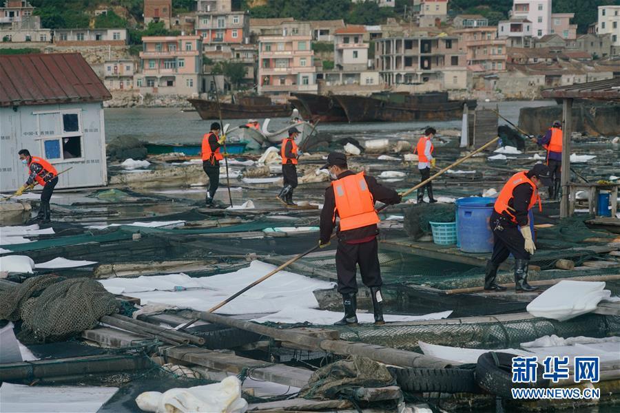 在福建省泉州市泉港區(qū)南埔鎮(zhèn)肖厝村附近海域漁排上,工作人員在清理漂浮物、鋪設吸油氈(11月6日攝)。新華社記者 宋為偉 攝