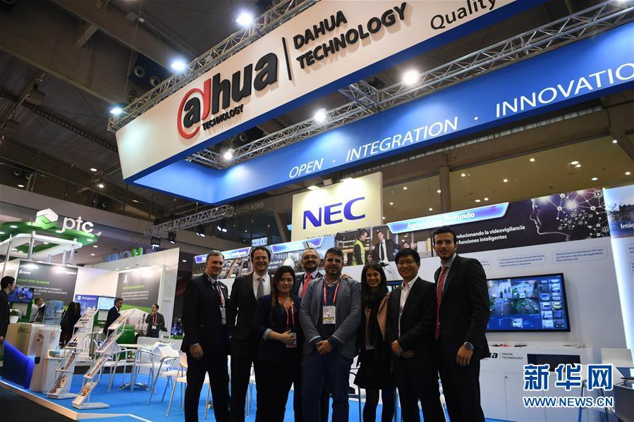 2017年11月15日,在巴塞羅那2017全球智慧城市博覽會上,浙江大華技術(shù)股份有限公司的中外員工在本公司展臺前合影。新華社記者郭求達攝