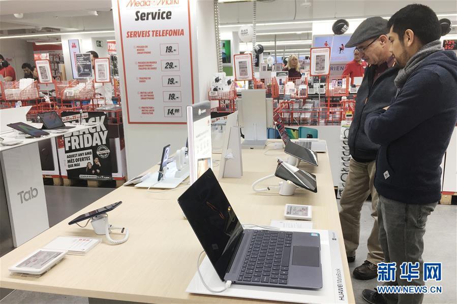 11月25日,顧客在西班牙巴塞羅那的一家電子用品商場選購華為智能電子產(chǎn)品。新華社記者鄭煥松攝