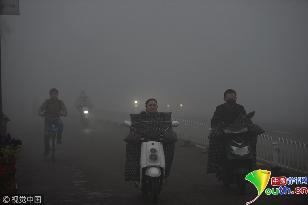2018年11月26日,全國多地出現(xiàn)大霧天氣。安徽亳州,市民在大霧彌漫的街頭出行。