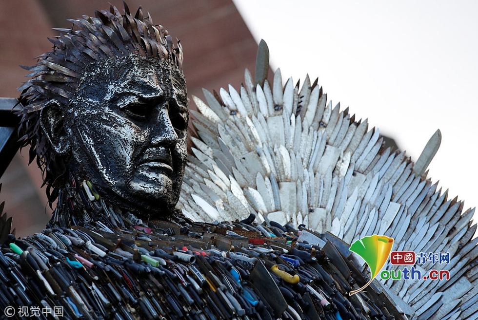 當?shù)貢r間2018年11月29日,英國利物浦,藝術(shù)家阿爾菲·布拉德利在圣公會教堂外用沒收的10萬多把刀具制作了一尊名為“刀之天使”的塑像。