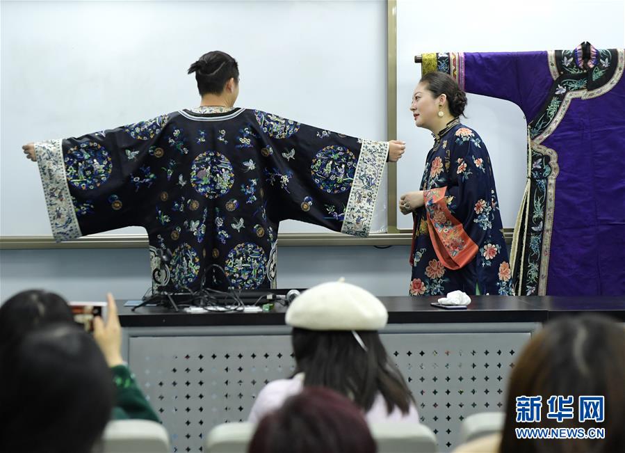 11月30日,在北京服裝學(xué)院,在畢紅(右)的邀請下,一名大學(xué)生試穿清代團花刺繡服裝。