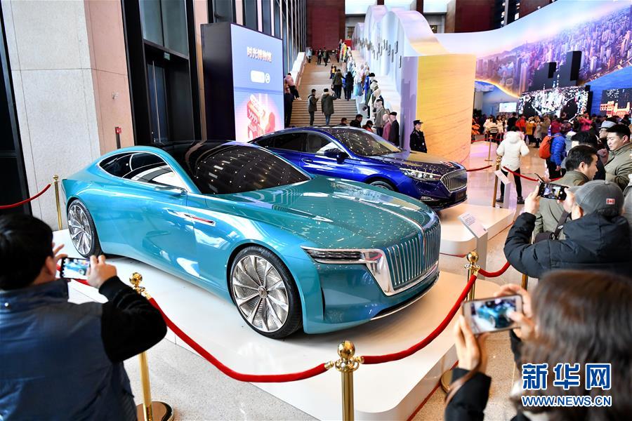 12月4日,觀眾在“偉大的變革——慶祝改革開(kāi)放40周年大型展覽”上參觀紅旗“E·境”概念車(左)。 新華社記者 李鑫 攝
