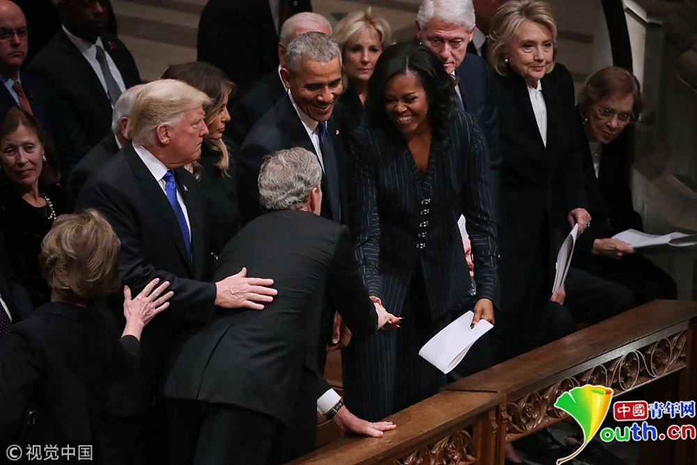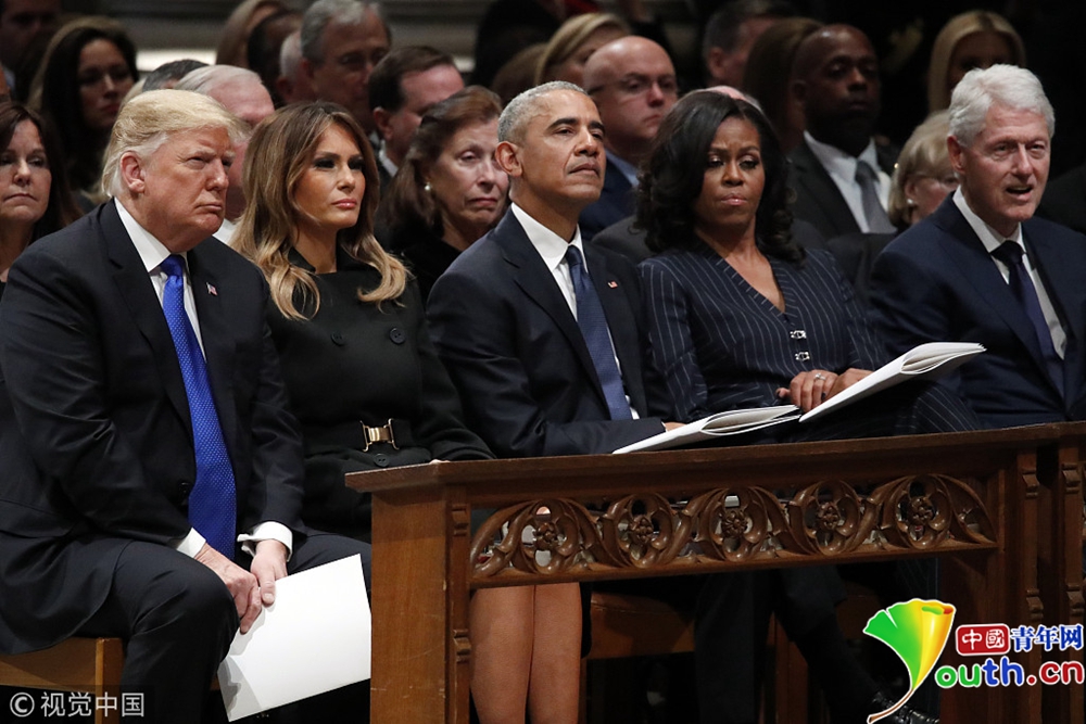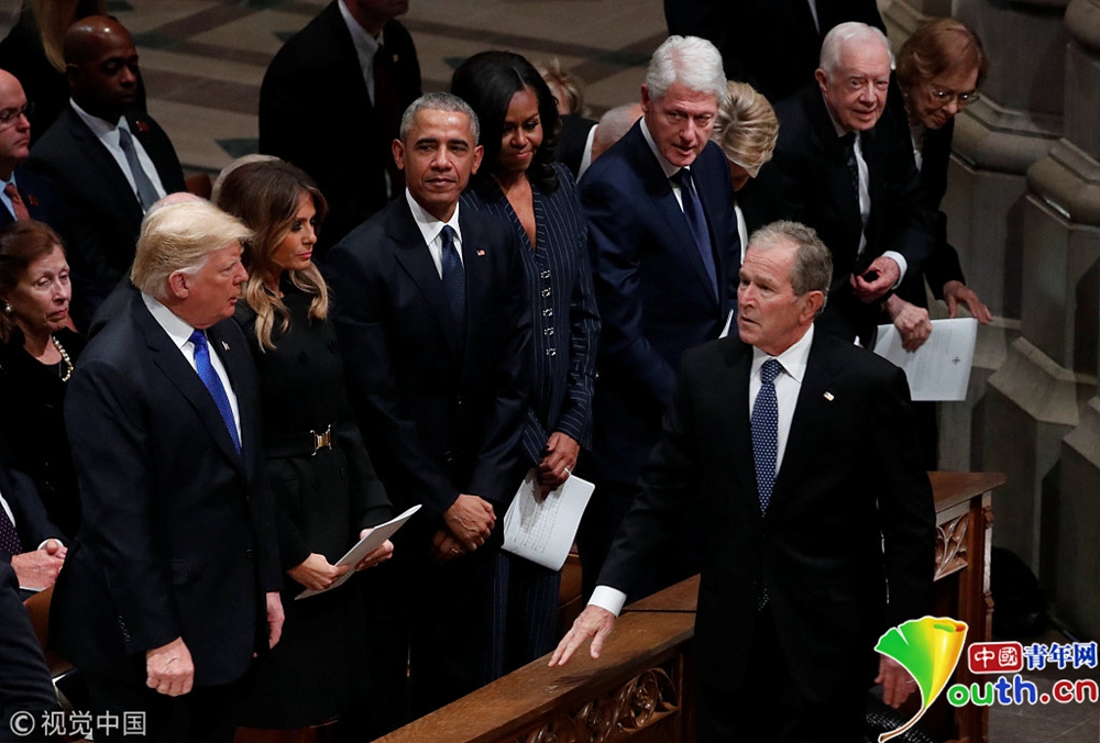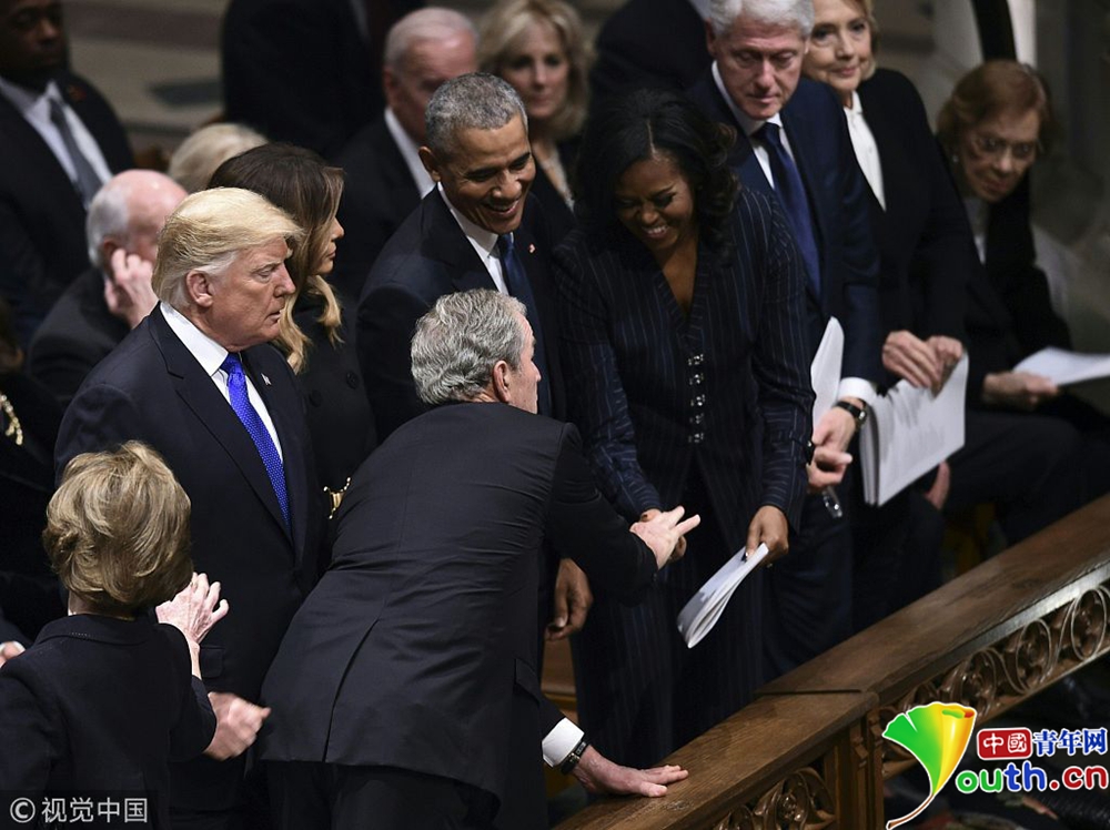 布什家族成員、現(xiàn)任總統(tǒng)特朗普、前總統(tǒng)奧巴馬等美國(guó)政界人士以及多名國(guó)際政要出席,為老布什送行。