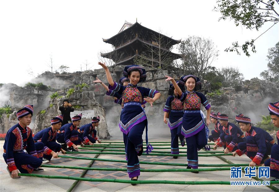 12月6日,演員在第十二屆中國(guó)(南寧)國(guó)際園林博覽會(huì)八桂天境園(廣西園)前跳竹杠舞。 新華社記者 周華 攝
