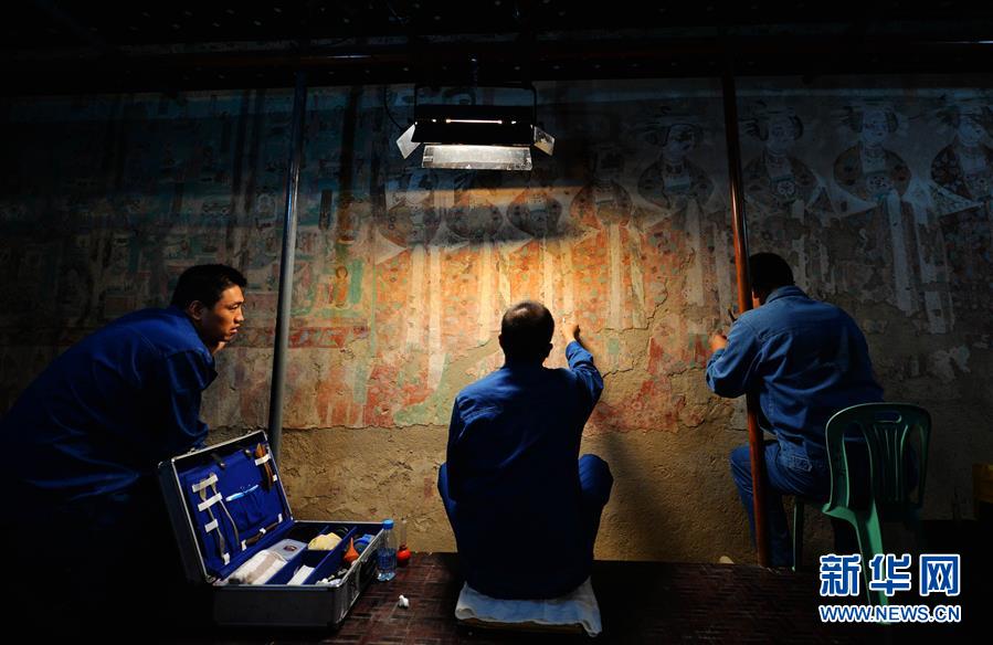 技術(shù)人員在莫高窟內(nèi)對(duì)病害壁畫進(jìn)行修復(fù)(2014年9月3日攝)。 敦煌記錄歷史。開放的胸襟,曾讓這里成為古代絲綢之路上“華戎所交一都會(huì)”。 時(shí)隔千年,改革開放的春風(fēng)吹入西北內(nèi)陸小城,敦煌再度成為中國(guó)對(duì)外開放的文化前沿。 新華社記者 陳斌 攝