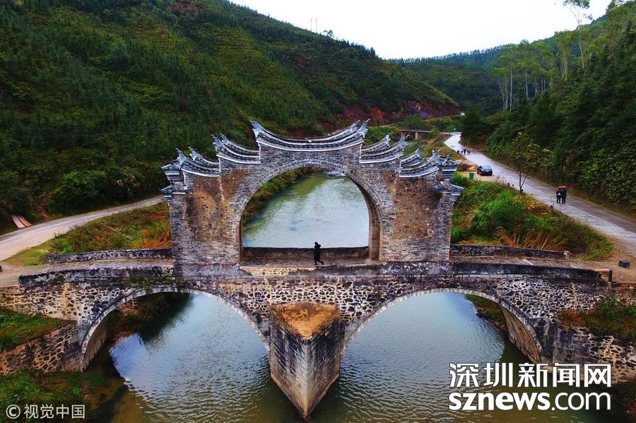 深圳新聞網(wǎng)2018年12月12日訊  太平橋位于江西省龍南縣楊村鎮(zhèn)街道北面太平江上,為兩孔三墩、四拱雙層重疊組合石拱橋。全長50米,造型奇特,上有四通涼亭,以方便行人覽勝和憩息。始建于明正德年間,為全國重點保護文物保護單位。 劉占昆 (江西分社)/中新社/視覺中國