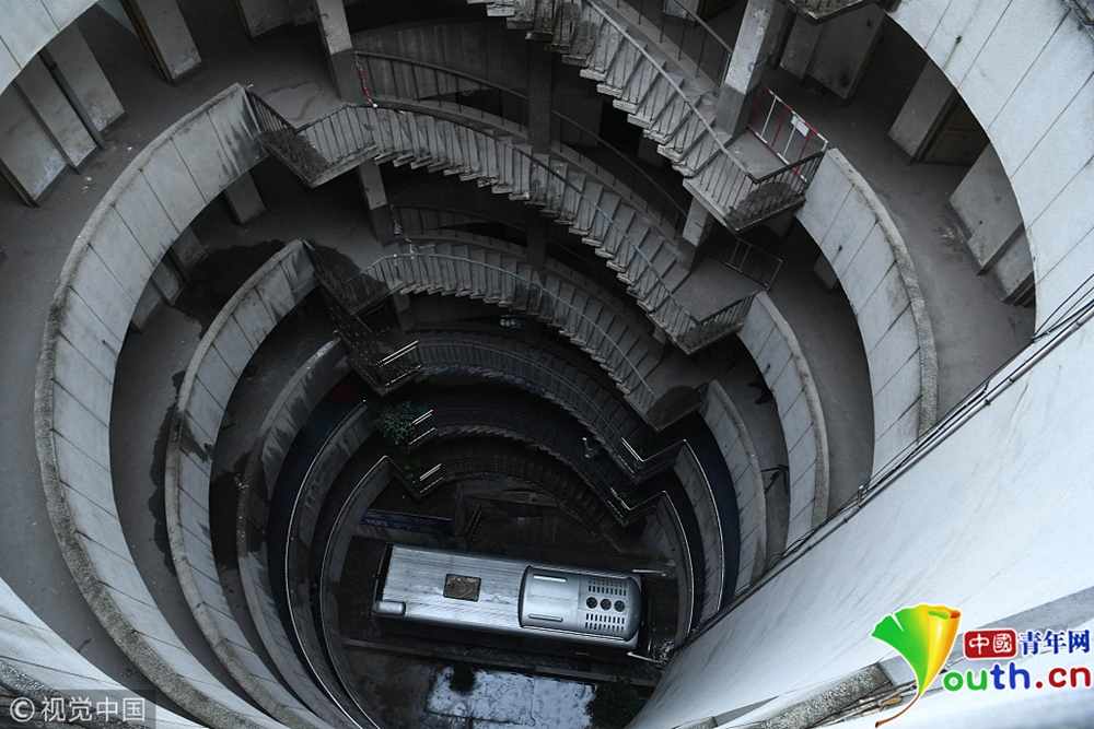 2018年12月6日,重慶江北紅旗河溝汽車站內(nèi),有一棟獨(dú)特的八層圓環(huán)狀建筑,底層每天有不少進(jìn)出站的客車通行。據(jù)悉,這棟樓建于1990年,曾經(jīng)是車站旅館,如今一、二兩層用于車站辦公,其余樓層已廢棄。為確保安全,三層以上已經(jīng)被封鎖。圖為公交車穿過8層空心圓筒樓。徐勇/視覺中國