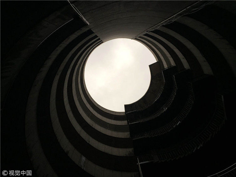 2017年9月27日,重慶,南岸區(qū)某小區(qū)的“螺旋”停車場(chǎng),從公路到車庫要下5層樓,司機(jī)需要轉(zhuǎn)無數(shù)個(gè)360度圈。圖片來源:視覺中國