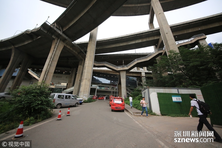 2018年5月29日,重慶,魔幻重慶又雙叒叕放大招!還有一個(gè)獨(dú)特的亮點(diǎn),重慶軌道交通3號(hào)線銅元局站,出口由一段長梯銜接上方立交橋和下方的路面,與全國最高城市立交橋蘇家壩立交組成了獨(dú)特風(fēng)景,許多游客專門趕來拍照。