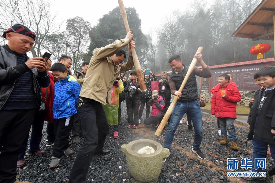 在江西宜春溫湯鎮(zhèn)水口村,游客體驗(yàn)傳統(tǒng)的打糍粑(3月2日攝)。