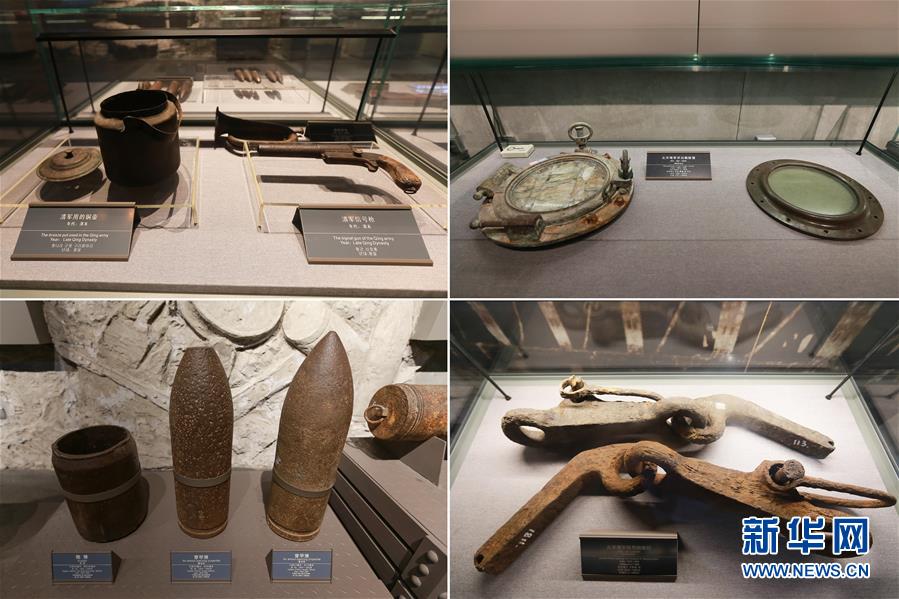 這是一張拼版照片,左上圖為:在甲午戰(zhàn)爭陳列館內(nèi)展出的清軍用的銅壺和信號槍;右上圖為:在甲午戰(zhàn)爭陳列館內(nèi)展出的北洋海軍濟遠艦舷窗;左下圖為:在甲午戰(zhàn)爭陳列館內(nèi)展出的炮彈和穿甲彈;右下圖為:在甲午戰(zhàn)爭陳列館內(nèi)展出的北洋海軍艦用拋錨鉤(12月8日攝)。 新華社記者王南攝