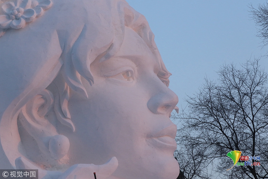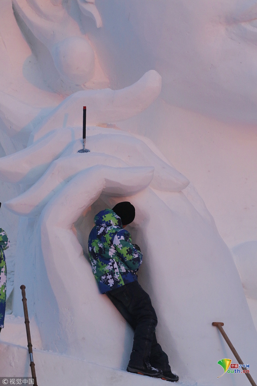 2018年12月13日,黑龍江省哈爾濱市,國內(nèi)最大的雪雕盛會太陽島雪博會正在緊鑼密鼓建設(shè)中,部分雪雕雛形已現(xiàn),雪雕師正在精雕細刻打磨中。