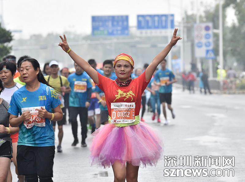 2018年12月16日,深圳國際馬拉松位于后海的折返點,即將抵達(dá)終點,一名選手?jǐn)[出勝利姿勢。