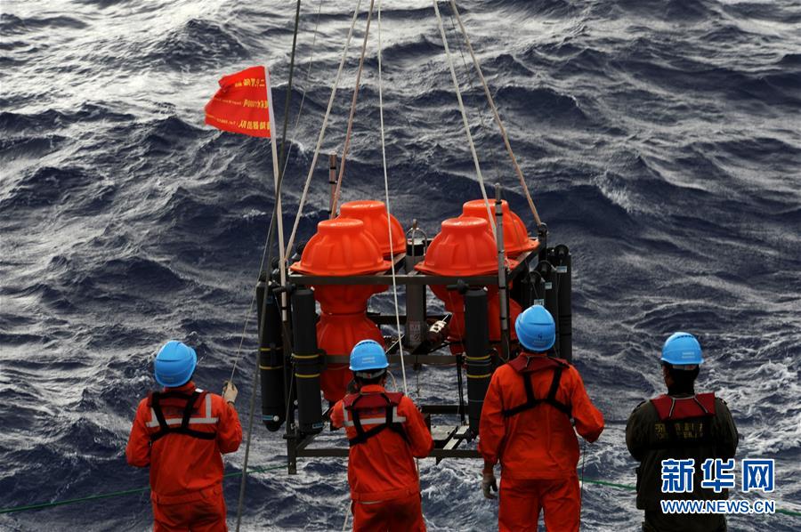 考察隊員在“沈括”號上布放“彩虹魚”著陸器(12月15日攝)。