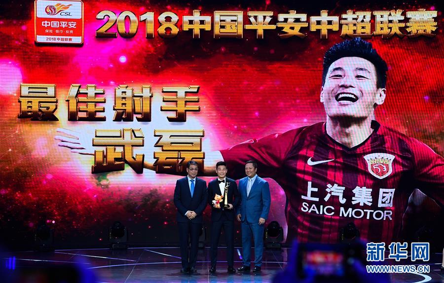 圖為2018年11月21日,獲最佳射手獎(jiǎng)的上海上港隊(duì)球員武磊(中)在2018中國(guó)平安中超聯(lián)賽頒獎(jiǎng)典禮上的資料照片。 新華社記者楊冠宇攝