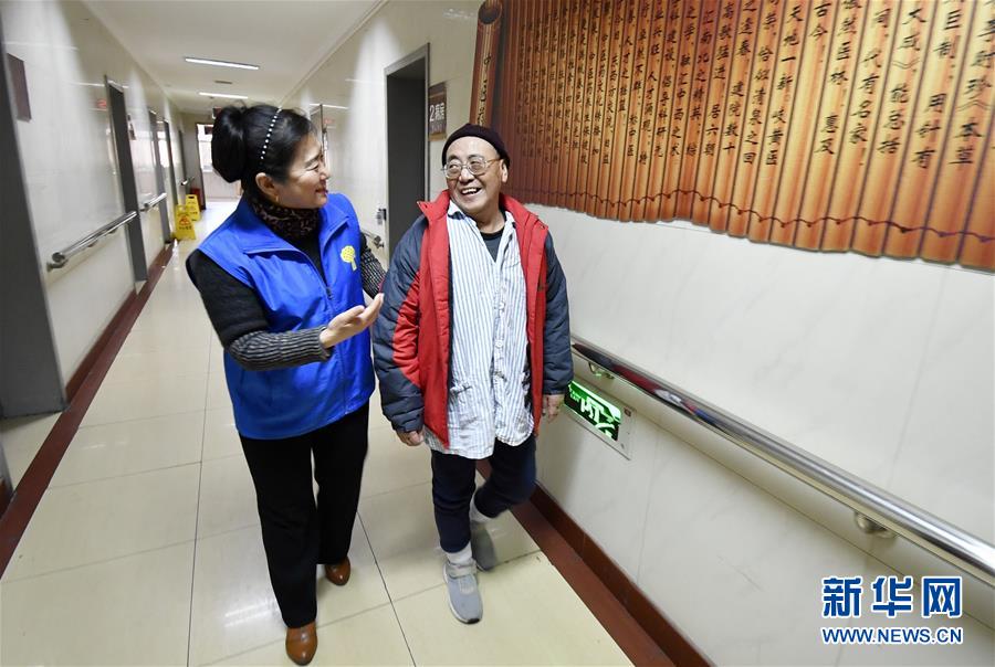 12月17日,豐臺(tái)區(qū)長辛店街道車輛廠社區(qū)養(yǎng)老服務(wù)驛站的員工陪同她們通過“連心通”救助的突發(fā)疾病獨(dú)居老人連鐵良(右)做康復(fù)。 新華社記者 李欣 攝