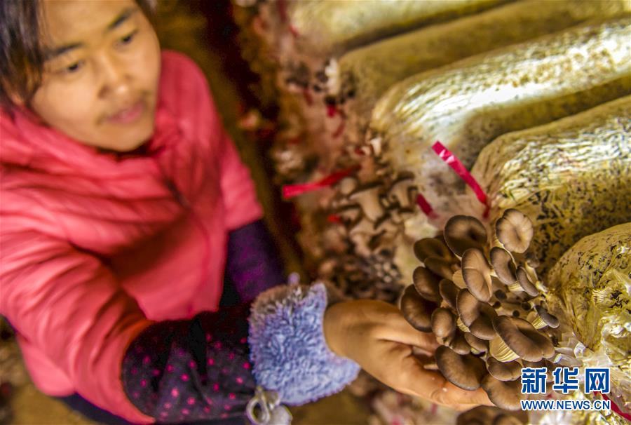11月18日,在衡水市冀州區(qū)周村鎮(zhèn)東高村食用菌種植基地的大棚里,村民在整理蘑菇。