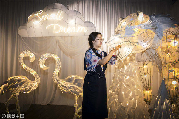 2018年5月6日,廣州,在天河區(qū)一家大商場辦個展時,用紙片做成的北極熊、大松樹、火烈鳥、紙房子在光線的配合下美輪美奐,吸引了很多顧客駐足?!皫缀趺總€人一看到,都會走進(jìn)那個夢幻的場景里,和這些紙雕一起合影。”圖片攝于2018年5月6日。