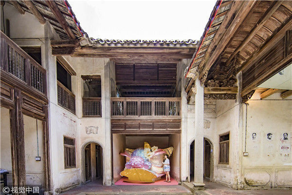 2018年8月10日,廣東揭陽(yáng),溫秋雯把獅子頭扒得只剩下骨架和包布,之后將不同顏色的紙片裁剪成三角形、鱗片形等不同形狀,作為裝飾獅子的皮毛,粘在獅子身上,獅子的鼻子則是用彩紙條以手鞠的方式纏繞而成,在獅頭內(nèi)部安裝了一盞白熾燈,一打開電燈,萌態(tài)可掬的獅子便呈現(xiàn)在人們眼前。紙片的顏色以淡粉、淡綠、淺白色為主,就這樣,人們平時(shí)印象中威猛的南獅,被改裝得萌萌的。圖為2018年8月10日,廣東省梅州市,溫秋雯和她的紙雕作品。