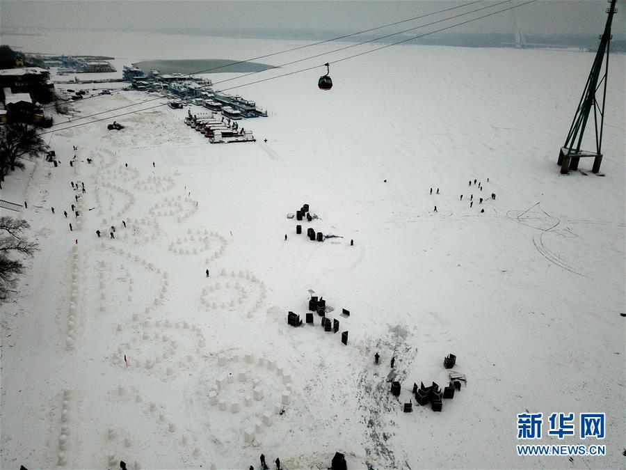 在松花江哈爾濱段江面上,制作中的部分雪人(12月21日無人機拍攝)。新華社記者王松攝