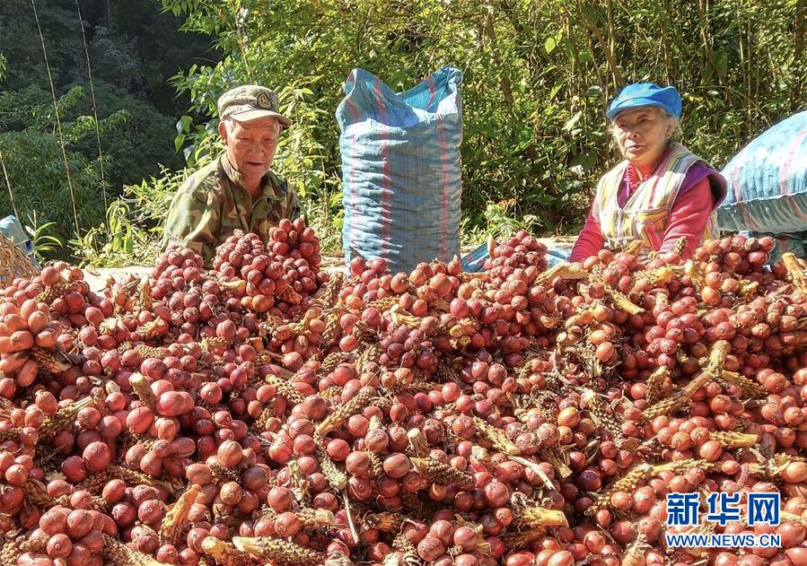 獨(dú)龍江鄉(xiāng)馬庫(kù)村村民在整理收獲的草果,準(zhǔn)備賣(mài)到外地市場(chǎng)(2018年11月10日攝)。  新華社發(fā)(楊時(shí)平 攝)