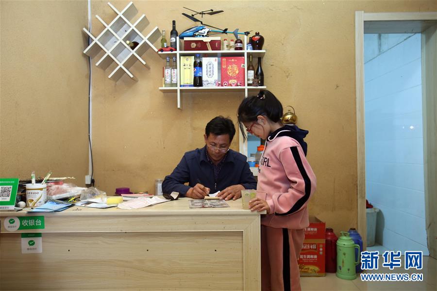 舒港發(fā)在自家的酒店里記賬,旁邊站著的是他的孫女(10月28日攝)。