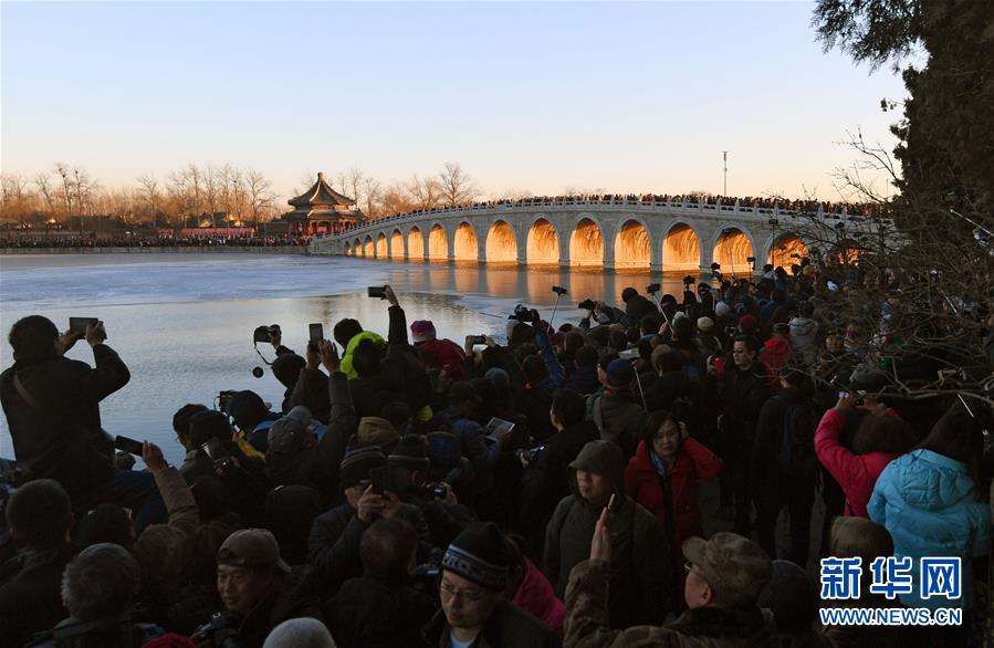 12月23日,游客和攝影愛好者在拍攝頤和園十七孔橋“金光穿洞”美景。 當(dāng)日,北京頤和園十七孔橋出現(xiàn)“金光穿洞”美景,吸引許多游客和攝影愛好者前來(lái)觀賞拍攝。 新華社記者陳曄華攝