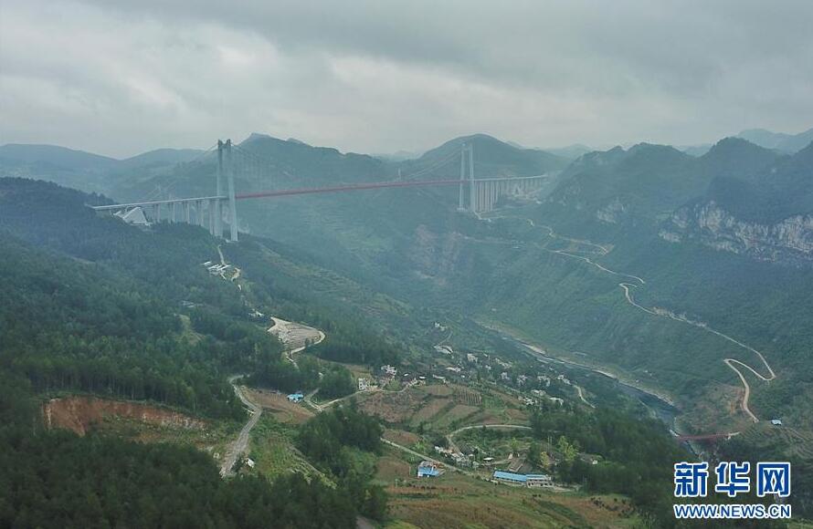 畢都高速公路北盤江大橋是杭瑞高速公路畢都段的控制性工程,位于貴州省和云南省交界處,由貴州省和云南省共建。該橋橋面至江面高差達(dá)565米,成為目前世界第一高橋。主橋?yàn)殇撹炝盒崩瓨?,主?20米,目前位居同類型橋梁2016年12月29日正式通車。