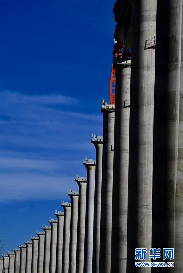 11月26日,施工人員在川藏鐵路拉林段貢嘎雅魯藏布江特大橋上鋪軌。 新華社記者 覺果 攝