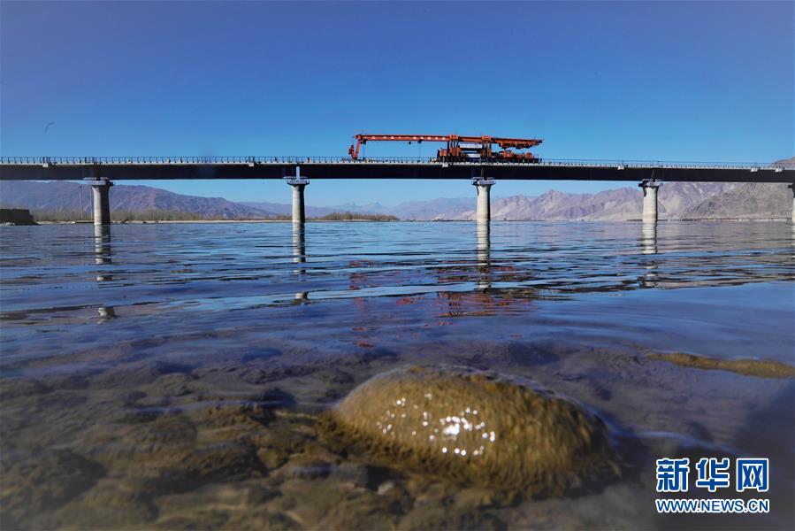 11月26日,施工人員在川藏鐵路拉林段貢嘎雅魯藏布江特大橋上鋪軌。
