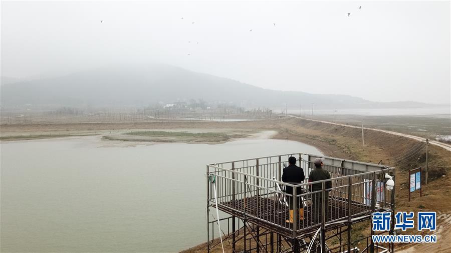 12月22日,王三益(左)在菜子湖濕地觀測(cè)候鳥(無人機(jī)拍攝)。 新華社記者 張端 攝