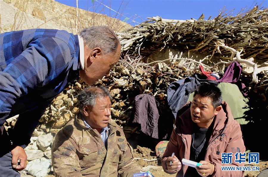 楚魯松杰鄉(xiāng)衛(wèi)生院院長次仁頓珠(右)為楚魯松杰鄉(xiāng)巴卡村卡熱組阿孜冬季牧場的牧民送藥(12月22日攝)。