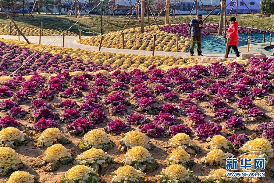12月24日,游人在北京玉淵潭公園觀賞甘藍(lán)。 日前,北京市玉淵潭公園移栽的三萬(wàn)多棵紫色和黃色羽衣甘藍(lán)盛開(kāi),為冬季公園增添了色彩。 新華社記者李欣攝