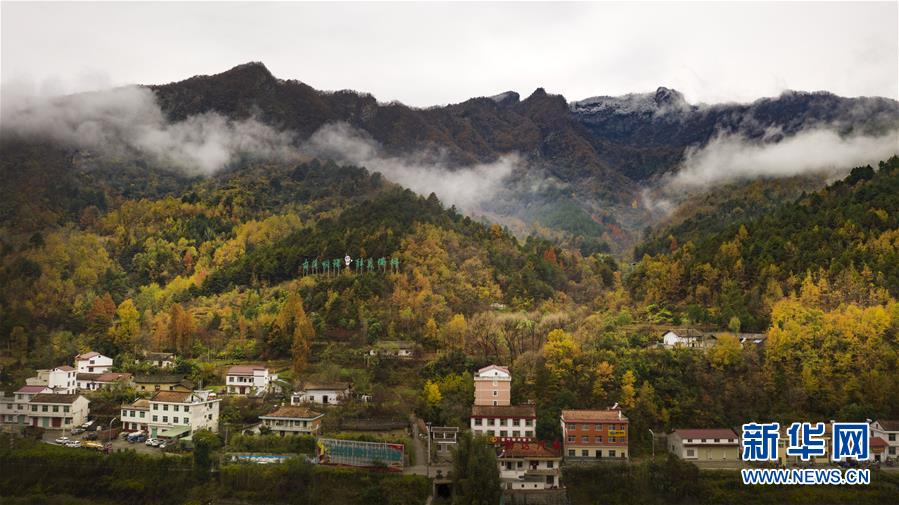 云霧中的鬼谷嶺國家森林公園山頂白雪皚皚,山腰秋色正濃(11月8日無人機拍攝)。 新華社記者陶明攝