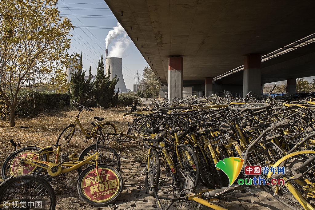 2018年11月22日,石家莊欒城。一座橋下的ofo小黃車堆積場。