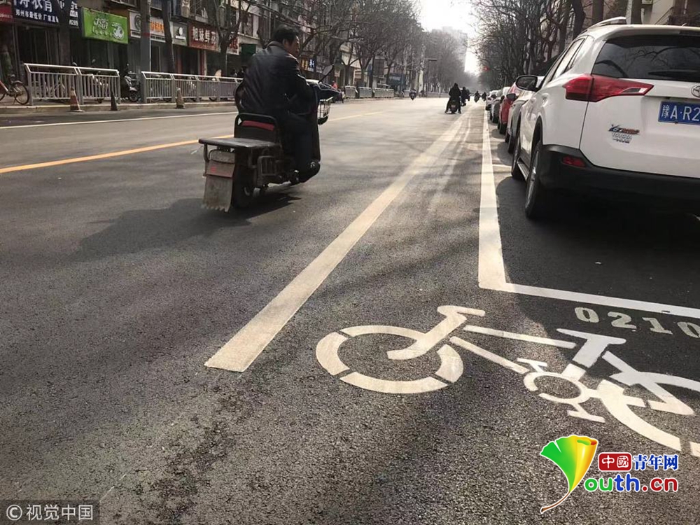 12月25日報道,12月24日,鄭州市文化宮路有市民反映,新鋪好的文化宮路非機(jī)動車道被剛劃的“停車位”擠得只有0.8米寬。原本2米多寬的非機(jī)動車突然有汽車停放后,騎車經(jīng)過的行人只得被逼進(jìn)快車道通行,很不安全。
