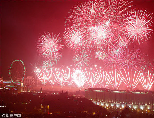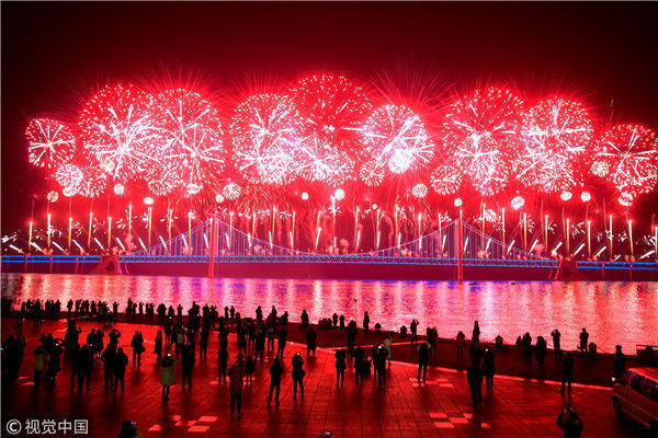 2017年12月31日,黑龍江黑河。近萬民黑河市民和數(shù)十名俄羅斯游客,身穿“中國紅”在中央街跳起熱舞迎接新年。