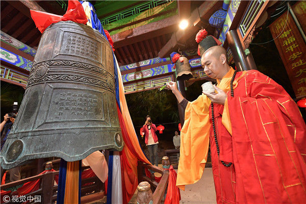 2017年1月1日零時(shí)許,海南三亞南山舉行撞鐘祈福迎新系列民俗文化活動(dòng),南山寺僧眾和游客敲響108響吉祥鐘聲,祈福國泰民安,迎接2018年的到來。