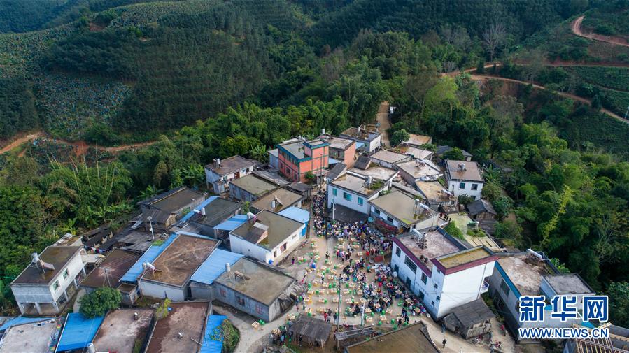 這是無(wú)人機(jī)拍攝的云南省金平苗族瑤族傣族自治縣者米鄉(xiāng)地棚村小組。村民李發(fā)財(cái)家新建起了兩層樓房,準(zhǔn)備請(qǐng)前來(lái)賀喜的族人吃飯,村里十分熱鬧(11月13日攝)。 新華社記者 胡超 攝