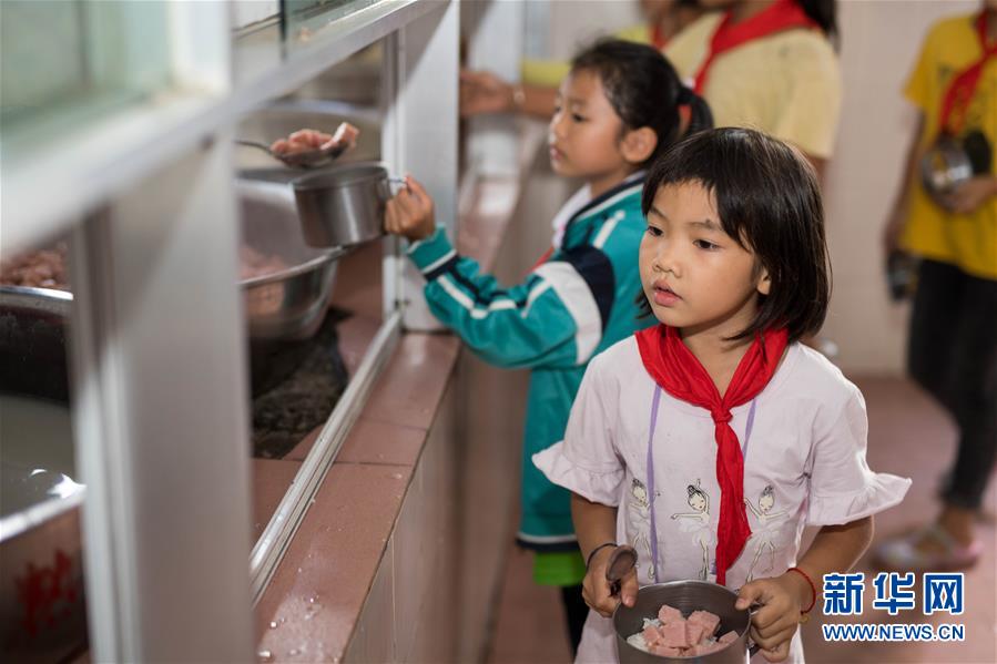 在云南省金平苗族瑤族傣族自治縣者米鄉(xiāng)中心小學(xué),孩子們?cè)谑程么蝻垼瑴?zhǔn)備吃營(yíng)養(yǎng)晚餐(11月13日攝)。新華社記者 胡超 攝