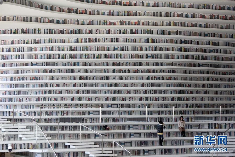 12月27日,讀者在天津濱海新區(qū)圖書館的“書山”上參觀。 濱海新區(qū)圖書館位于天津濱海文化中心,2017年10月1日正式開館,設計立意為“濱海之眼”和“書山有路勤為徑”。圖書館現(xiàn)有藏書60多萬冊,一年多來接待讀者約280萬人次,已成為濱海新區(qū)的文化“新地標”。 新華社記者段卓力攝