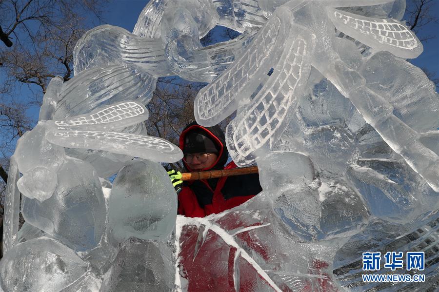 12月27日,選手在比賽中完善冰雕作品。 當日,第十六屆黑龍江省大學生冰雕藝術(shù)設(shè)計創(chuàng)作大賽在哈爾濱兆麟公園落下帷幕,全省高校共有99支隊伍參賽。 新華社記者曹霽陽攝