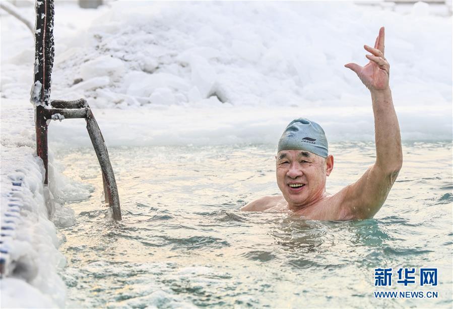 12月28日,冬泳愛好者在烏魯木齊紅山游泳中心游泳。