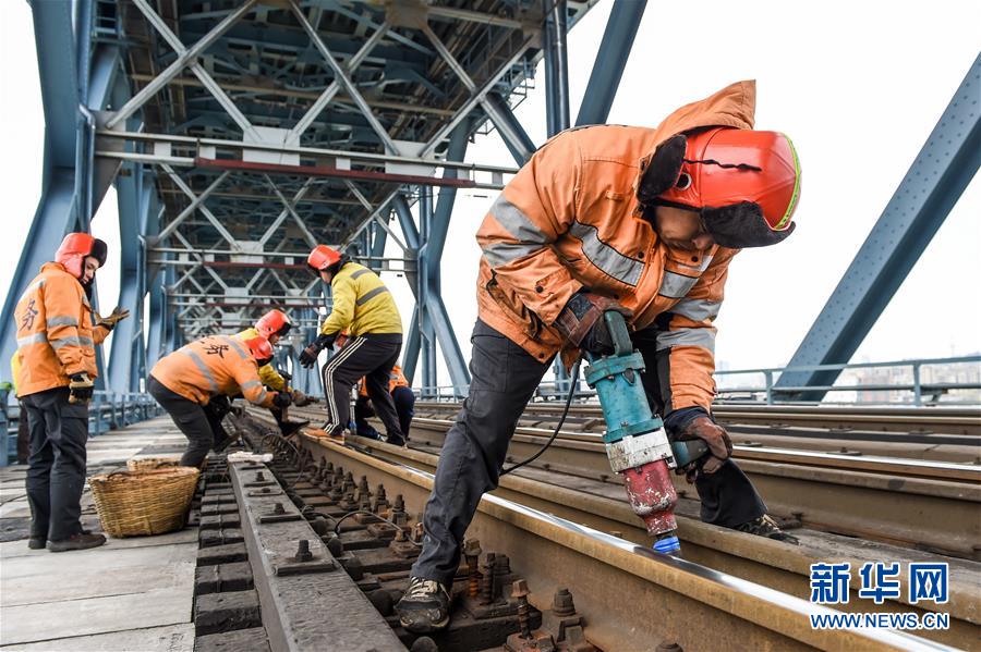 線路工劉非(右一)在南京長(zhǎng)江大橋鐵路橋進(jìn)行木枕改道作業(yè)(12月27日攝)。