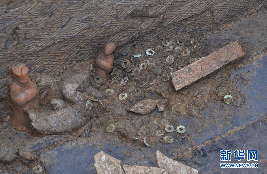 這是發(fā)掘的隨葬“搖錢樹”底座(11月15日攝)。
