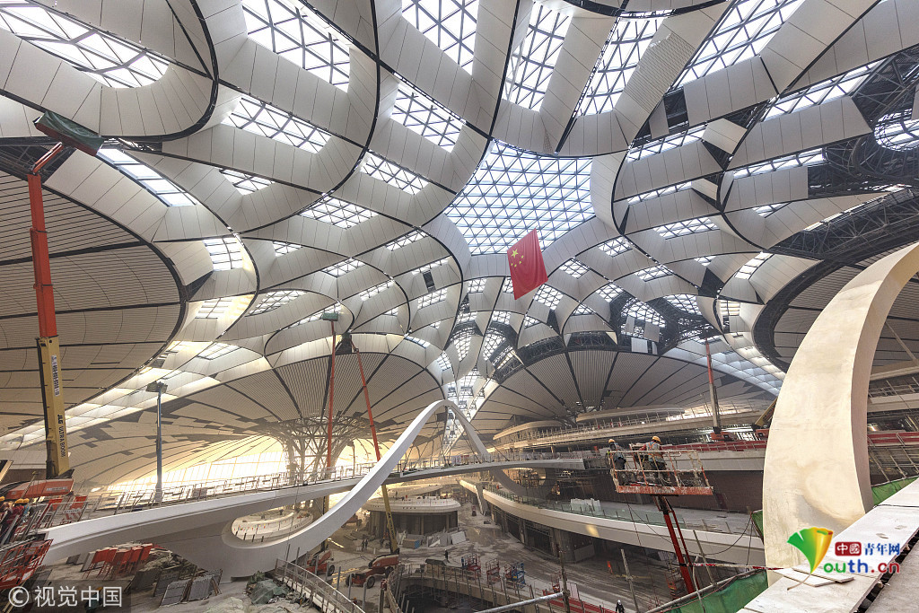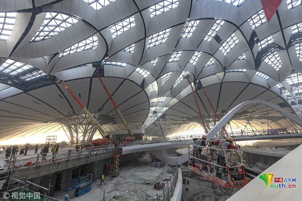 中國青年網(wǎng)北京12月20日電 2018年12月19日,北京大興國際機(jī)場航站樓的屋面已基本完工,一只金色“鳳凰”完整地出現(xiàn)在北京城南。航站樓的室內(nèi)裝修在有條不紊的推進(jìn)中。