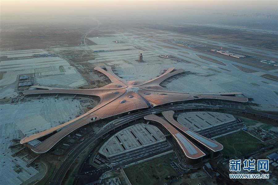 12月29日拍攝的北京大興國際機(jī)場(無人機(jī)拍攝)。 當(dāng)日,在北京大興國際機(jī)場,隨著清晨第一縷陽光灑在航站樓古銅色的屋頂上,寓意“鳳凰展翅”的航站樓呈現(xiàn)出金光燦燦的景象。 新華社記者 鞠煥宗 攝 圖片來源:新華網(wǎng)